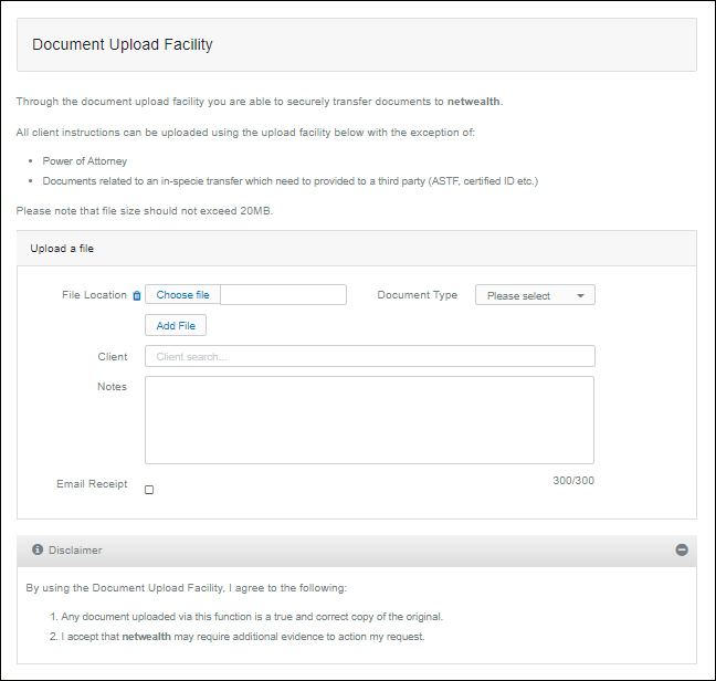 This feature removes, in most cases, the need to send your document to Netwealth Contact and may save you the need to print and scan client documents. Learn more.