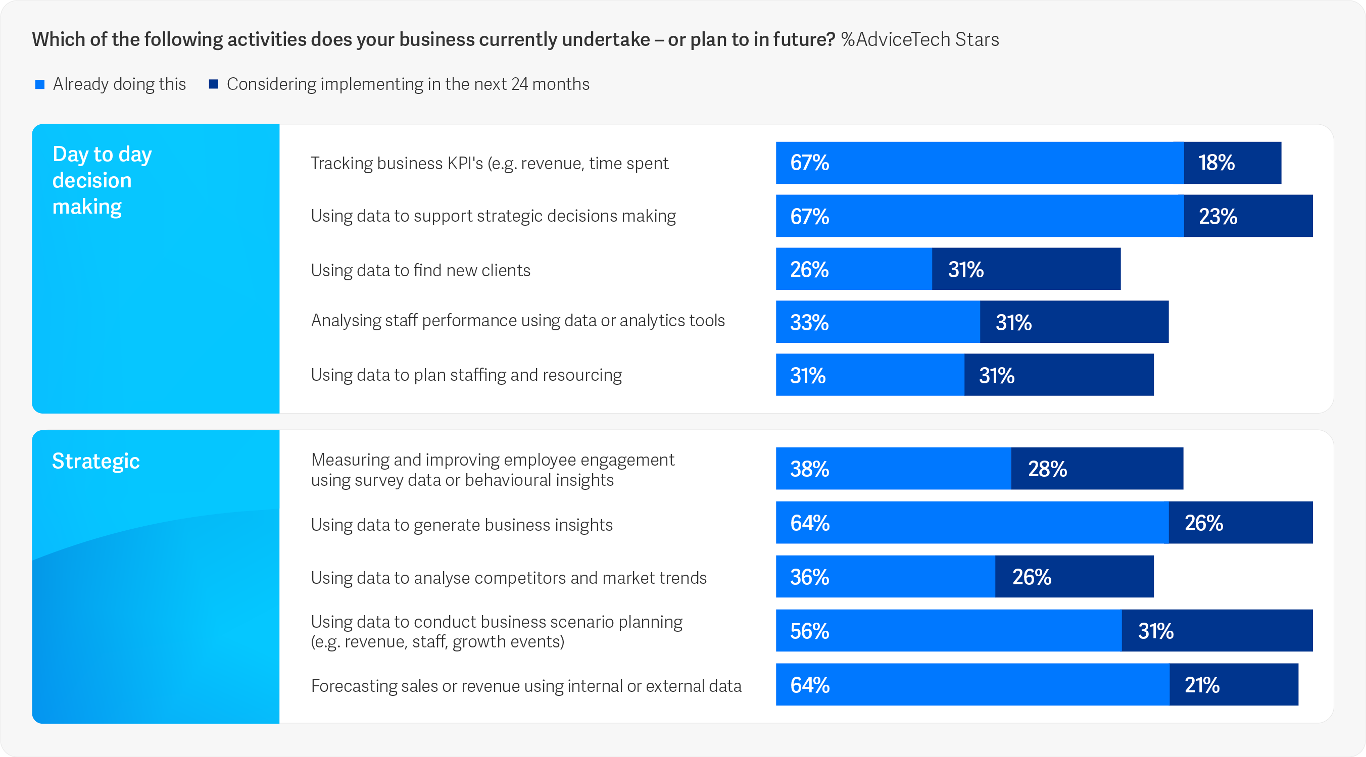 Data is also playing a central role in guiding growth strategies. A quarter (24%) of AdviceTech Stars use data to identify new client opportunities, and nearly a third (31%) are considering this. Advice businesses are leveraging analytics to support strategic decisions (67%), generate broader insights (64%), run scenario planning on revenue and staffing (56%), forecast sales (64%), and track competitors and market trends (36%). These capabilities allow advice firms to spot unprofitable clients, underused services, and cross-sell opportunities. The insights also help determine where to invest in training and focus marketing efforts.