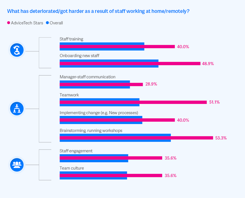 Onboarding staff is seen as harder by over one in three (34.3%) firms and more so for Stars (48.9%) as is staff training (29.4% of firms vs 40.0% of Stars). Teamwork has suffered too (27.7% overall vs 51.1% of Stars), which includes deteriorated team communication (24.1% vs 22.2% of Stars) and running workshops or brainstorming sessions (38.6% overall vs 53.3% of Stars).
